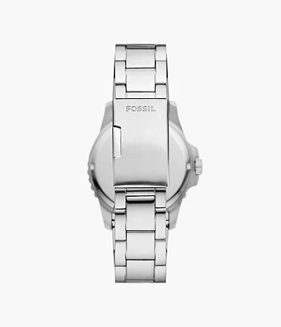 Purposeful design details define our time-honoured watch collection, Fossil Blue Dive. This stainless steel dive-style timepiece is expertly crafted with a 3-link stainless steel bracelet, geometric indices and a unidirectional rotating topring. Tested to 100 meters of water resistance. *Not ISO certified.