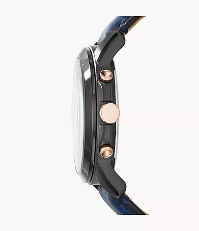 This season, the traditional leather Grant evokes a sunny outlook with bright blue and rose dial pops. Topped with a shiny black case and chronograph movement, it's an all-around favourite for the season.