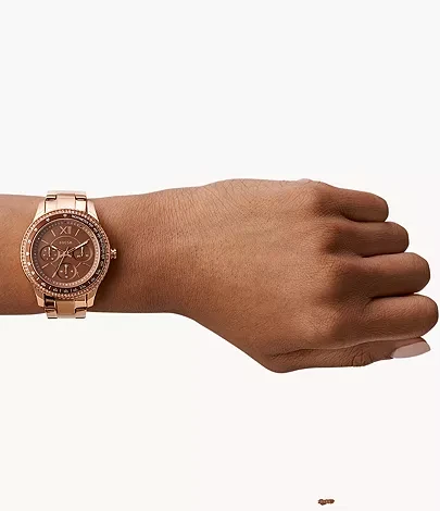 This 37mm Stella Sport features a brown satin, sunray dial, multifunction movement and rose gold-tone stainless steel bracelet.
