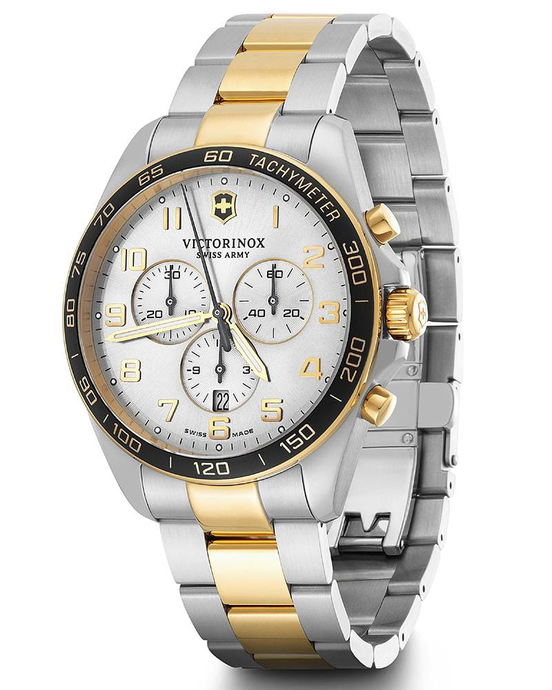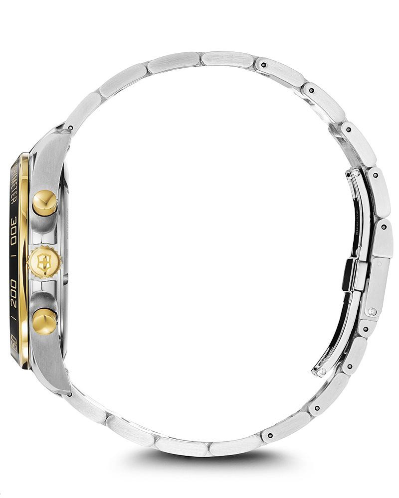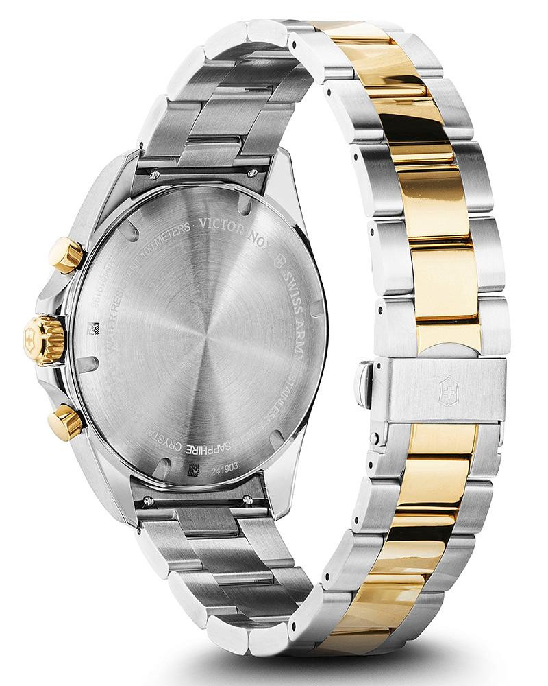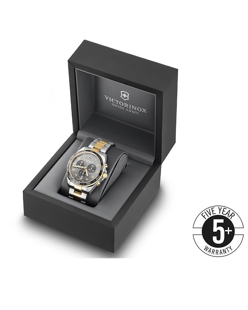 Victorinox Swiss Maverick Watch: A sophisticated, two-tone timepiece with stainless steel and gold-tone case and bracelet. Features a white dial with clear numerals, chronograph sub-dials, and unidirectional rotating bezel. 100m water resistance for versatile use. Powered by a reliable quartz movement, blending classic Swiss craftsmanship with a modern, functional design.