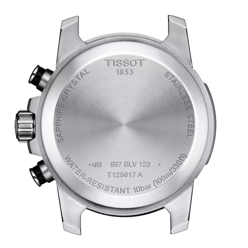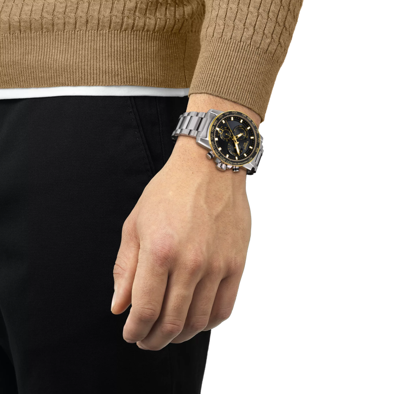 Die Tissot Supersport Chrono Kollektion ist perfekt für den modernen Gentleman, der seine Uhr im Alltag, Büro sowie bei sportlichen Ereignissen tragen möchte. Die geraden Linien und scharfen Kanten in Kombination mit dem 45,5 mm Gehäuse verleihen der Tissot Supersport Chrono eine starke Persönlichkeit. Die massiven Indizes mit SuperLuminova® Beschichtung sowie die asymmetrischen Applikationen auf dem Zifferblatt sorgen für einen kraftvollen 3D-Effekt, ein dynamisches Erscheinungsbild und ermöglichen eine beeindruckende Lesbarkeit bei Dunkelheit. Alle Modelle des Tissot Chrono Supersport haben ein massives 316L- Edelstahlgehäuse, kratzfestes Saphirglas und besitzen eine Wasserdichtigkeit bis zu einem Druck von 10 bar (100 Metern/330 Fuß). Diese Ausführung der Tissot Supersport Chrono besitzt ein Swiss-Made Quartzwerk sowie ein Bicolor 316L-Edelstahlgehäuse mit gelbgoldfarbener PVD-Beschichtung. Das schwarze Zifferblatt besitzt Indizes und eine Datumsanzeige. Das massive 316L-Edelstahlarmband ist mit Sicherheitsfaltschließe und Taucherverlängerung ausgestattet.