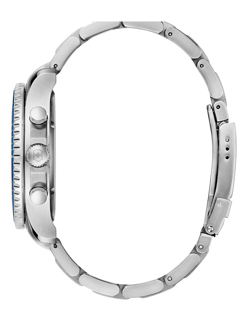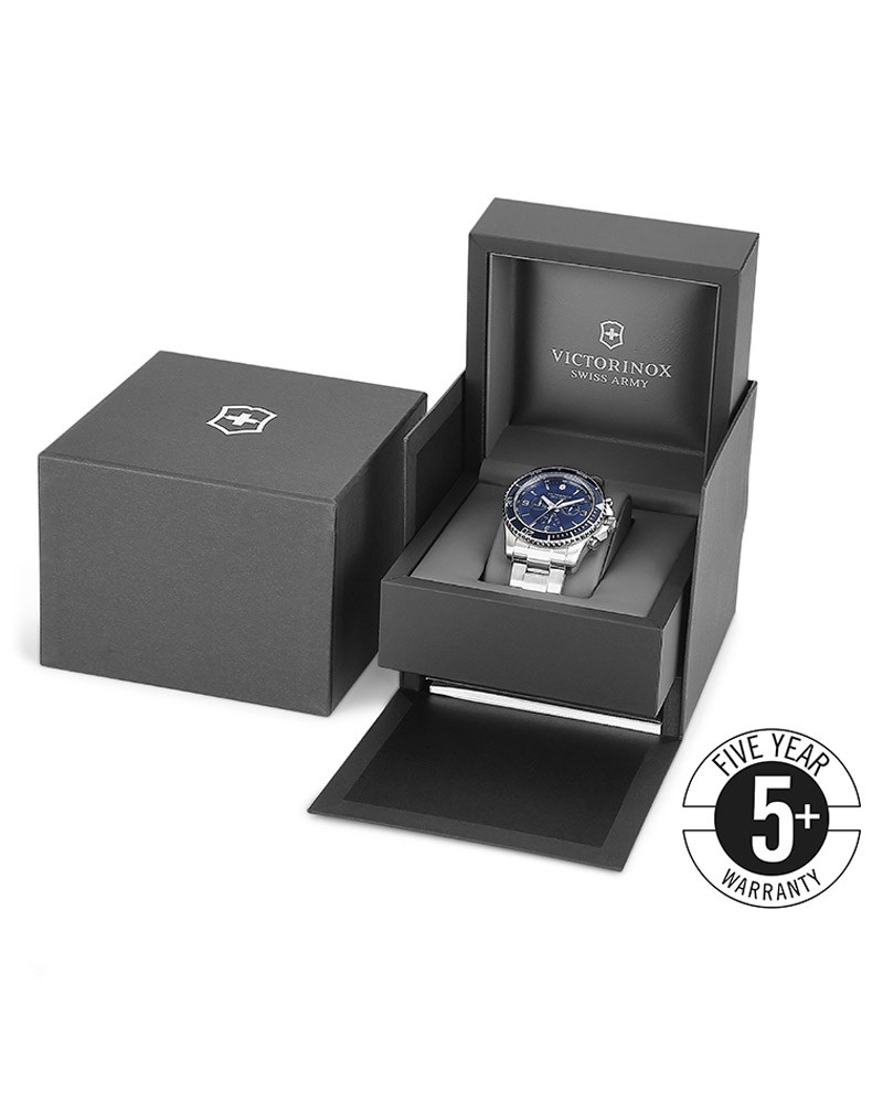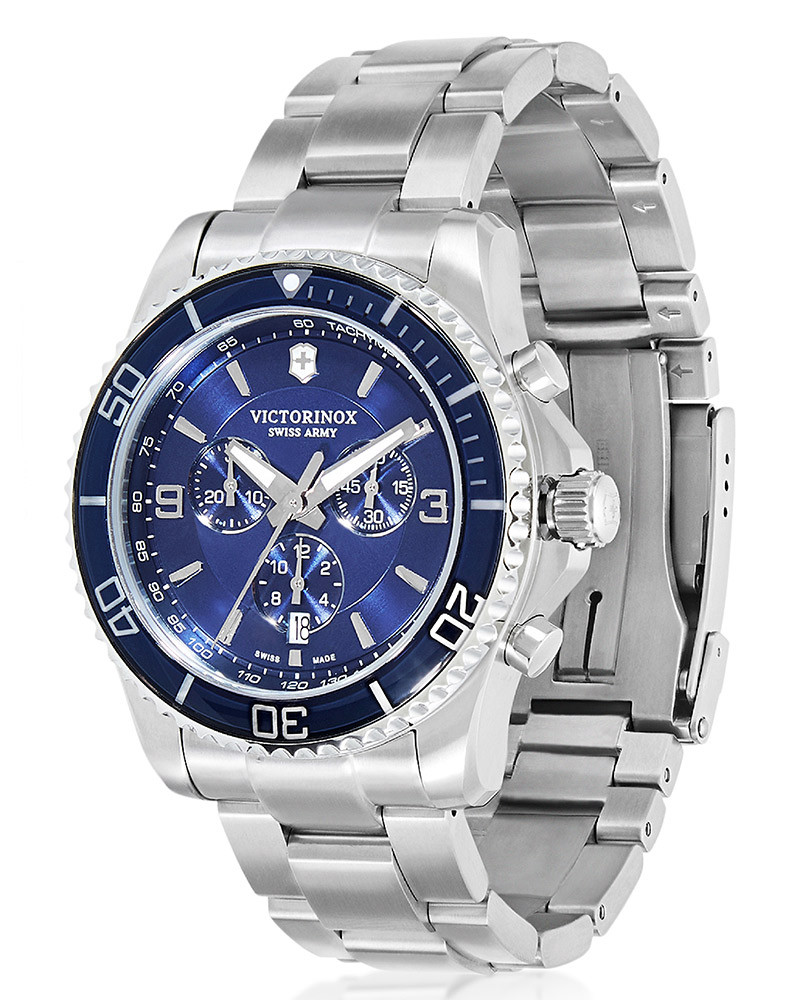 A blend of elegance and functionality, the Victorinox Maverick Chronograph is a versatile timepiece for the modern man. This Swiss-made watch features a 43mm stainless steel case with a blue dial and a silver toned bracelet. The chronograph function offers stopwatch functionality, while the tachymeter bezel allows for speed calculations. The watch boasts a scratch-resistant sapphire crystal for durability, making it suitable for everyday wear.