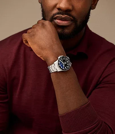 Purposeful design details define our time-honoured watch collection, Fossil Blue Dive. This stainless steel dive-style timepiece is expertly crafted with a 3-link stainless steel bracelet, geometric indices and a unidirectional rotating topring. Tested to 100 meters of water resistance. *Not ISO certified.