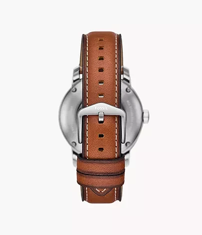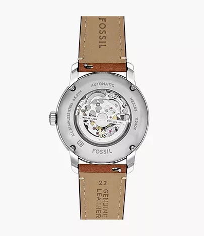 This expertly crafted Fossil Heritage watch is the result of our decades-long dedication to quality watchmaking. Featuring a three-piece case with a stepped profile, a blue skeleton dial showcasing the precision automatic movement, a double-domed, scratch-resistant sapphire crystal and brown leather strap. Fossil leather products support responsible manufacturing via the Leather Working Group.